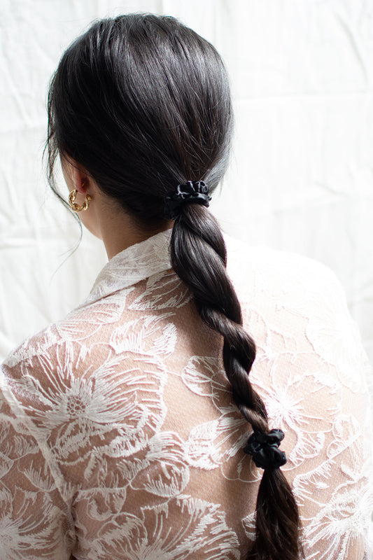 SMALL SILK SATIN SCRUNCHIES 2 PC SET IN BLACK