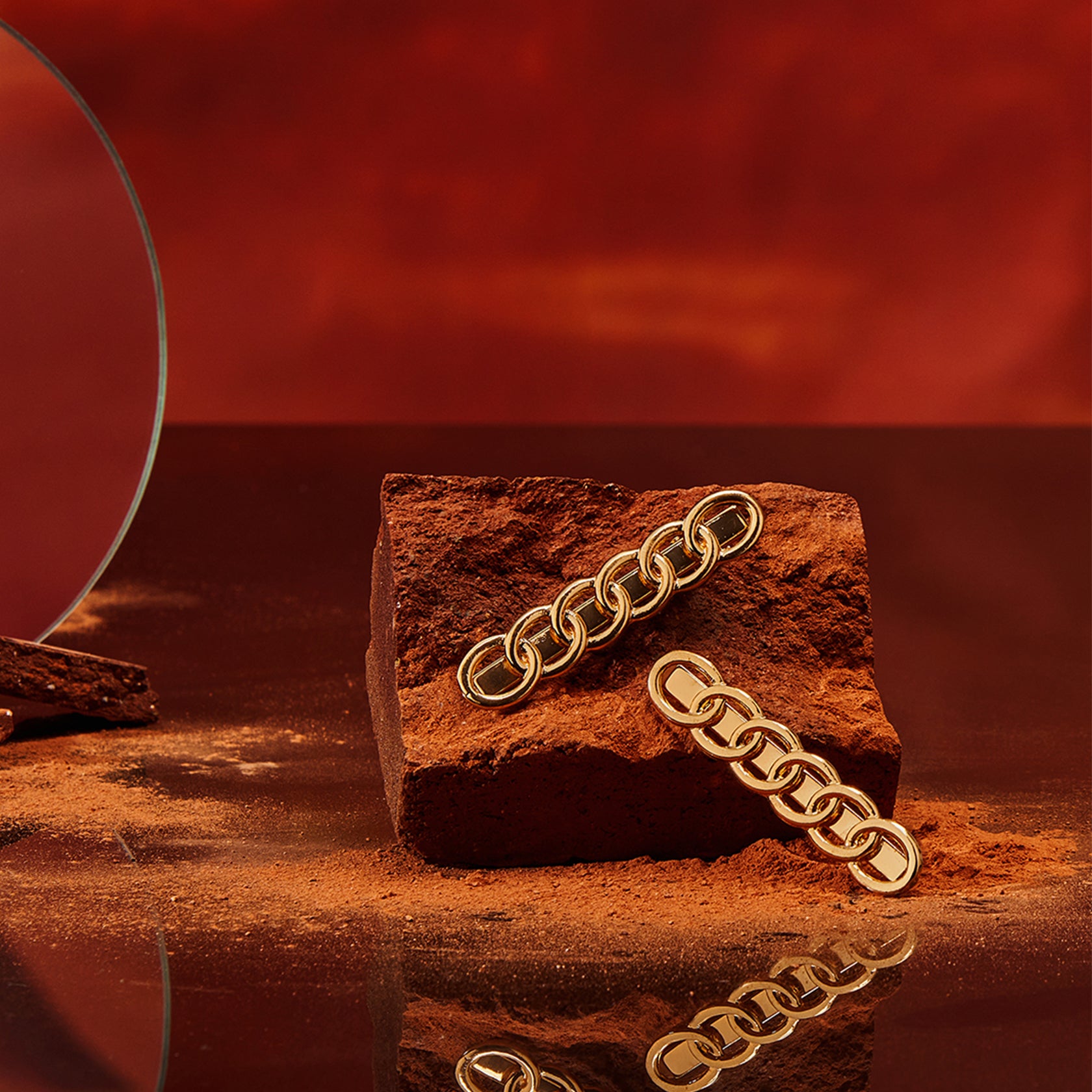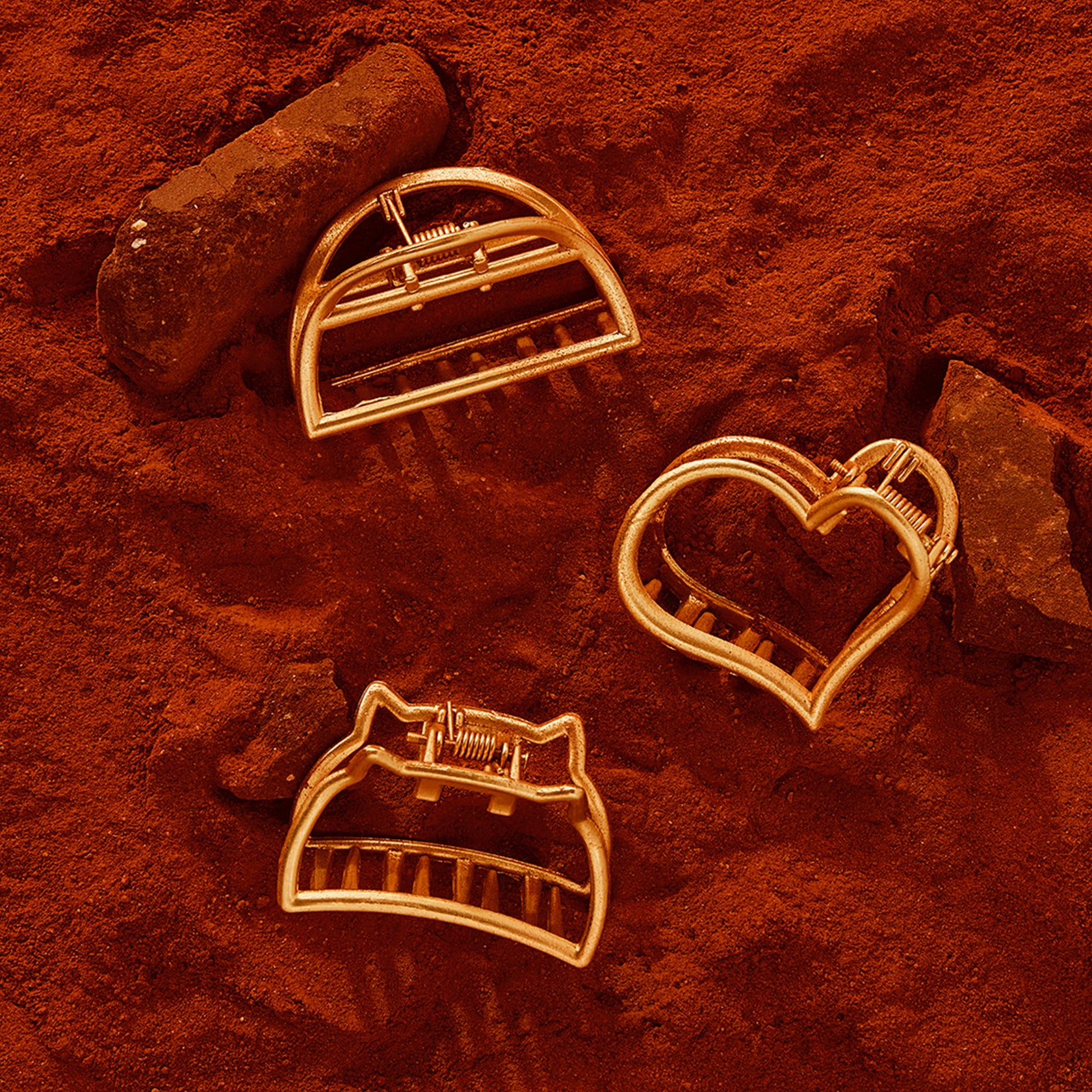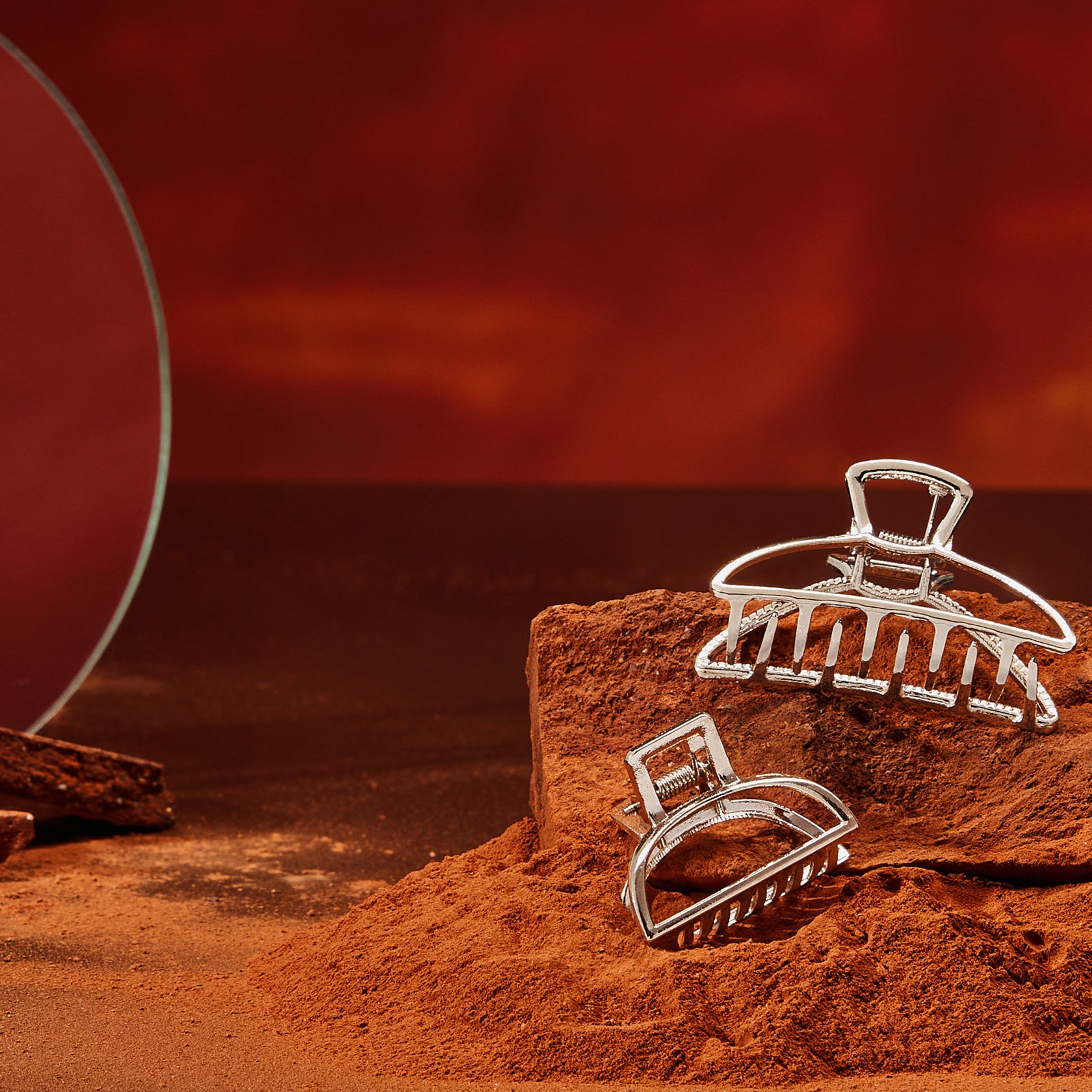 Set against landscapes of red rocks, dust, and clay evoking Mars itself, the imagery captures the raw, otherworldly beauty of venturing past familiar skies. Each piece is sculpted to shine in gravity defying ways: strong, luminous, and ready to hold its own in any atmosphere.